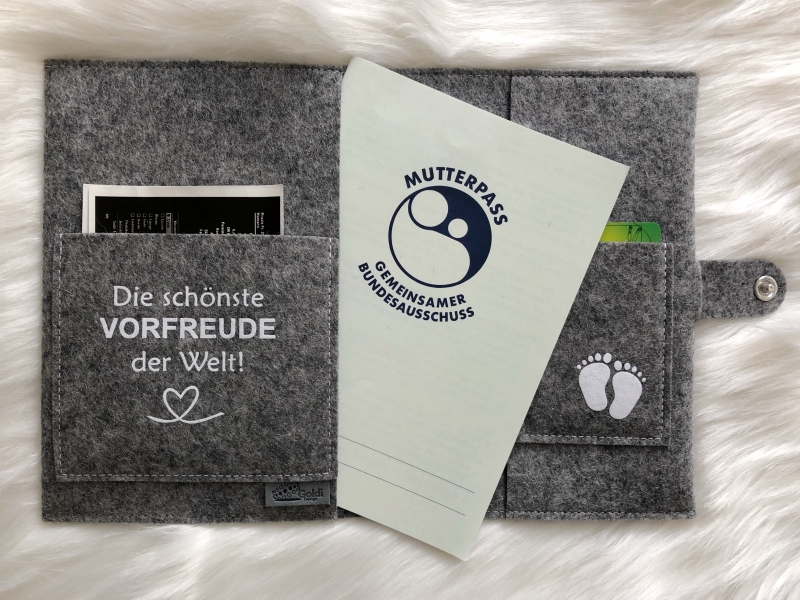 Diese hier wurde aus hochwertigem 100% Wollfilz in Deutschland gefertigt und aufwendig bestickt. Zwei Innenfächer bieten Platz für Ultraschallbilder und die Krankenkassenkarte. Ausserdem kann man in den breiten Umschlägen im Innenbereich sonstige wichtige Dokumente aufbewahren.